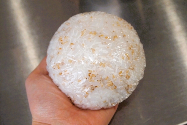 完成した巨大おにぎりがこちら。握りこぶしよりも大きいサイズで、インパクト抜群です!