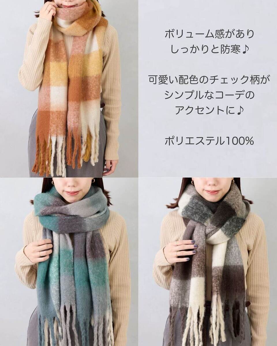 可愛い配色のチェック柄が、シンプルなコーディネートのアクセントに!ボリューム感もあり、しっかりと防寒できますよ。