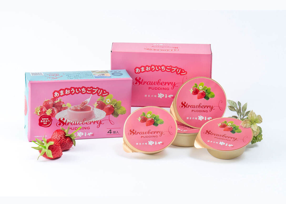 福岡のブランド苺「あまおう苺」のジャムと果汁を使用したプリン。常温保存が可能で、気軽に持ち運びができるため九州のお土産としてオススメです。