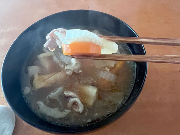 まずはひと口、あつあつのお汁をすすってみるとほんのり甘さを感じます。たまねぎの甘さでしょうか。さまざまな食材のうまみとコクが詰まっていて、あぁおいしい、と声が出ます。