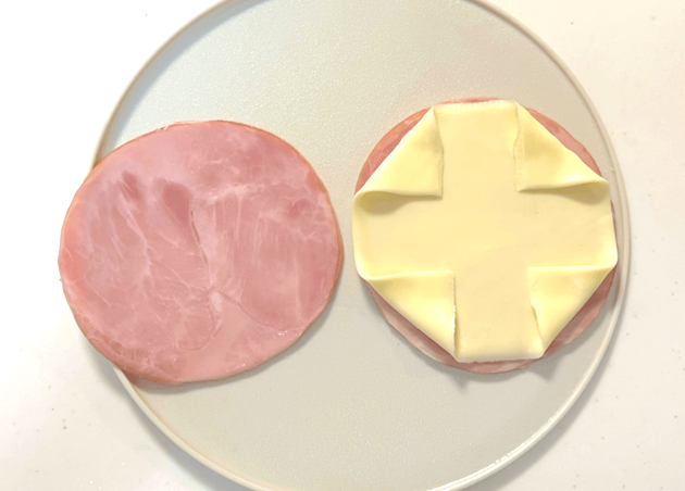 ハムを4枚重ね、真ん中にとろけるチーズをハムの形に収まるように折りたたんではさみます。