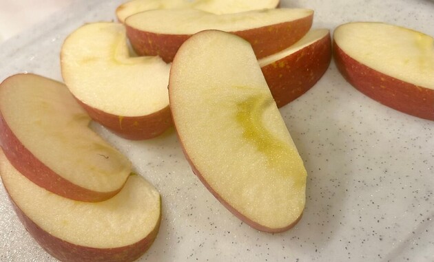 りんごをよく洗って、8等分のくし形に切り、芯を除いておきます。