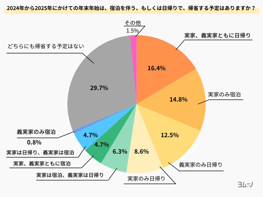 「(実家・義実家)どちらにも帰省する予定はない」という方が29.7%で最も多く、次いで「実家・義実家ともに帰省する予定(どちらも日帰り)」という方が16.4%、「実家のみに帰省する予定(宿泊を伴う)」が14.8%でした。