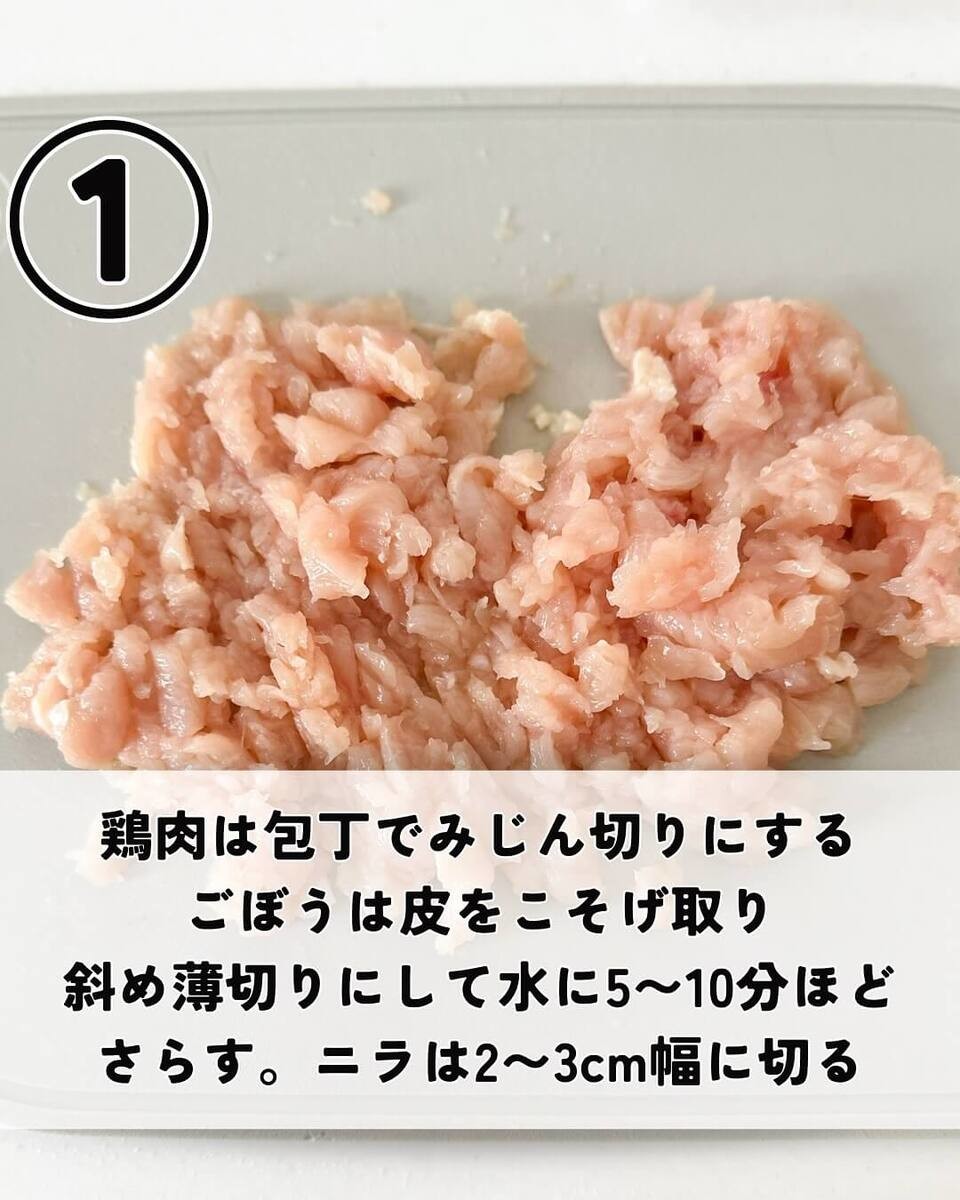 ごぼうは皮をこそげ取り、斜め薄切りにして水に5〜10分ほどさらしておきましょう。ニラは2〜3cm幅にカットします。