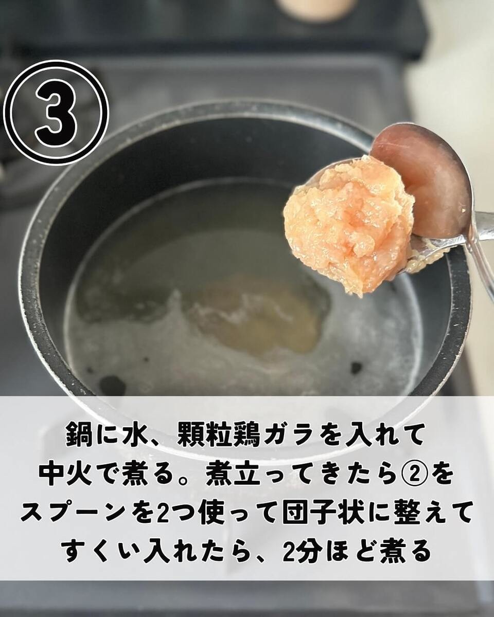 鍋に水と顆粒鶏ガラスープの素を入れて、中火で煮ましょう。煮立ってきたら作り方②で用意した鶏肉を、スプーンを2つ使ってだんご状に整えていきます。まいのごはん。さんは8等分にわけているそうです!