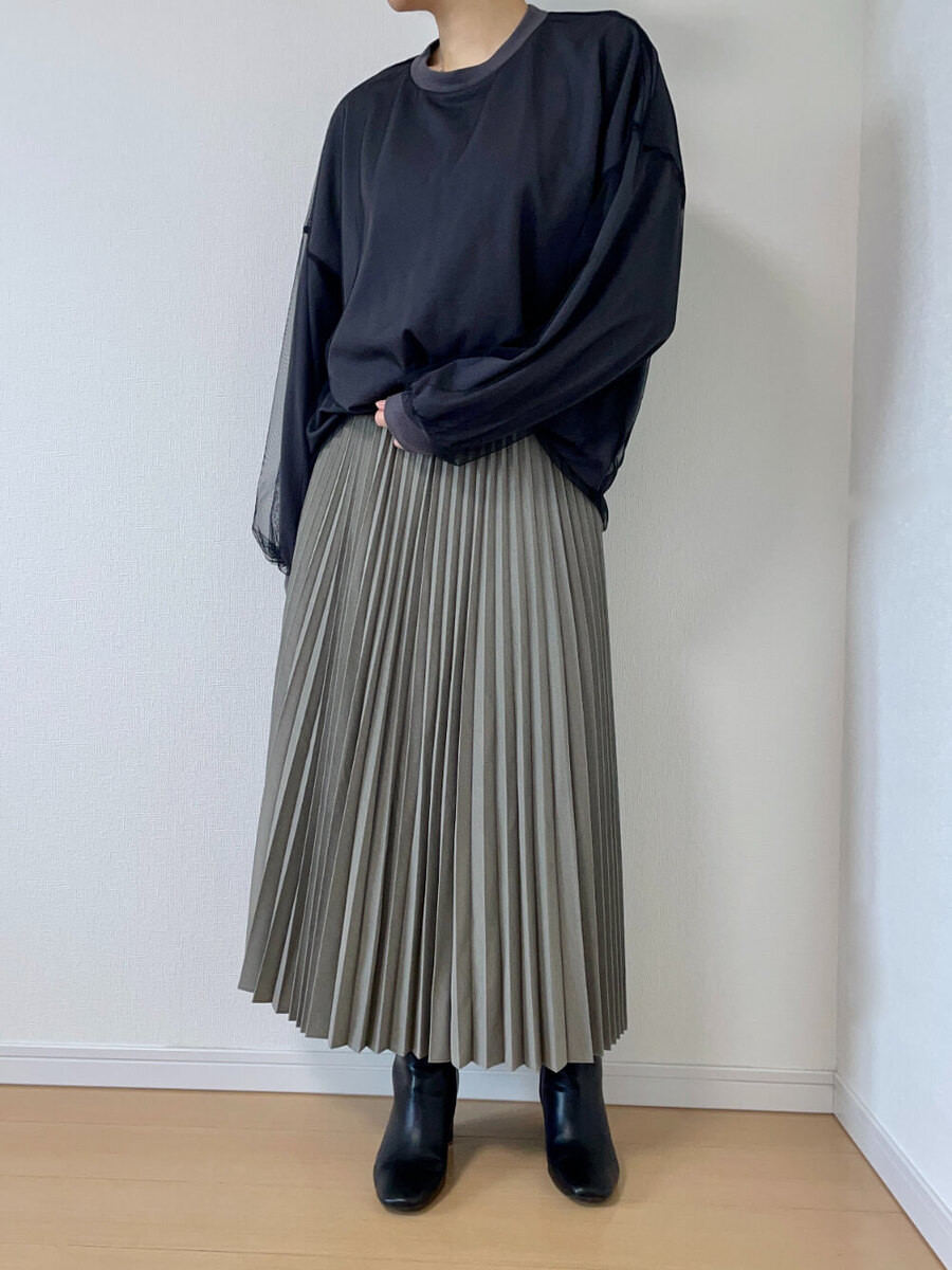 ここからは、「プリーツロングスカート」を使ったコーディネートをご紹介していきます!