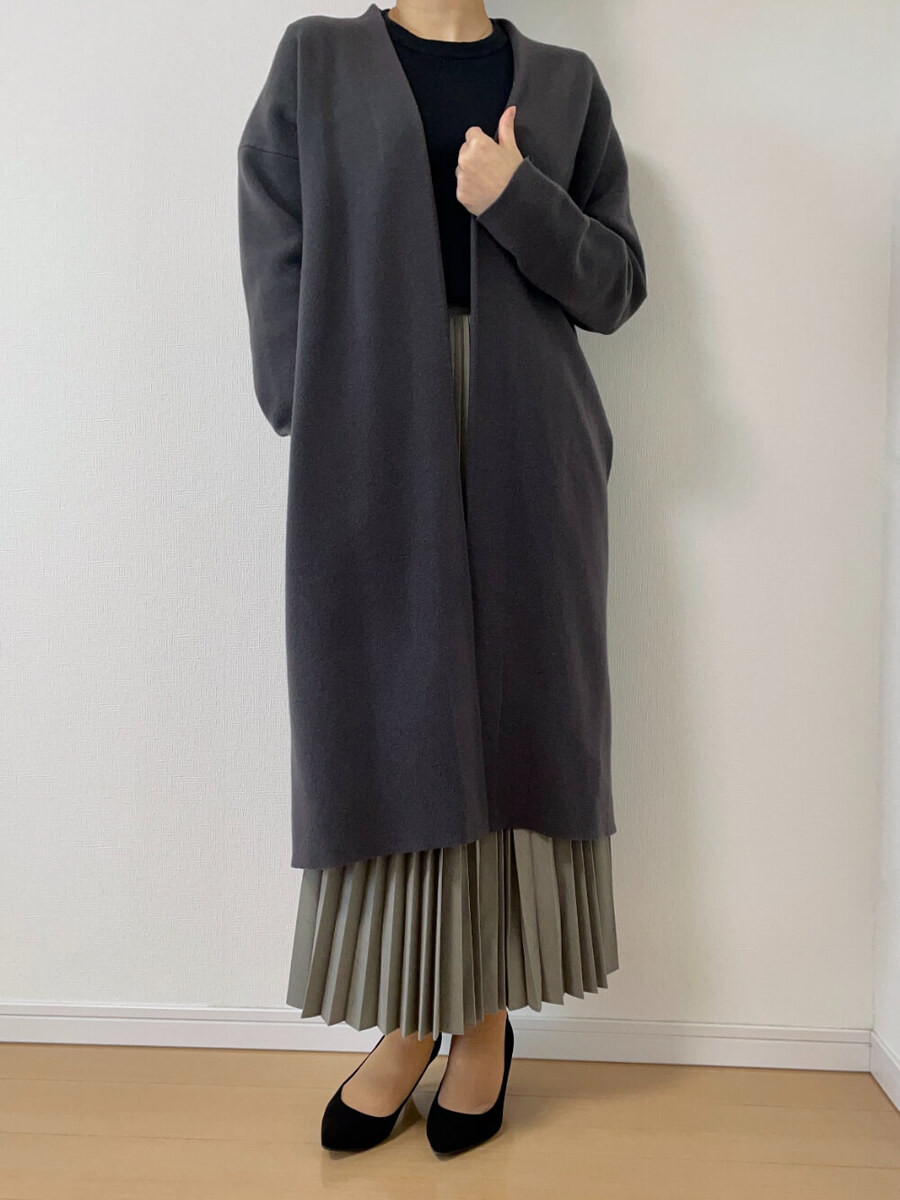 サッと羽織れてこなれ感が出るこちらのニットガウンは、3年前にユニクロで購入した「スフレヤーンニットコート」です。 ユニクロのスフレヤーン素材は手触りが本当に気持ちよくて、毎年どんなアイテムが登場するのか楽しみにしています!
