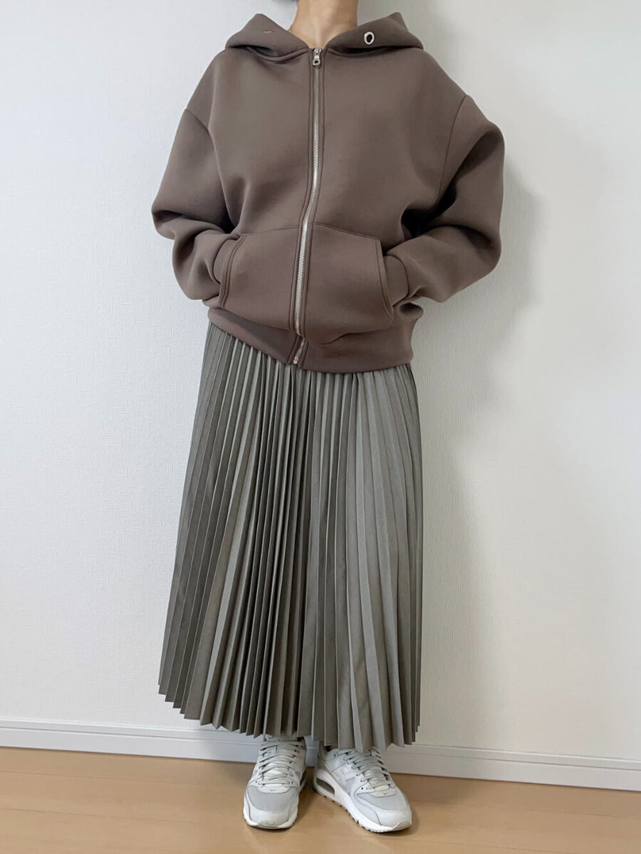 カジュアルアイテムのパーカーをトレンドであるダンボール素材にすることで、キレイめカジュアルに格上げ!さらにプリーツスカートの程よい重たさが高見え効果をアップさせています。