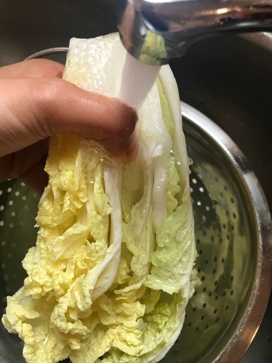 白菜を水洗いしておきましょう。白菜は芯から取れないように1枚1枚、丁寧に洗います。