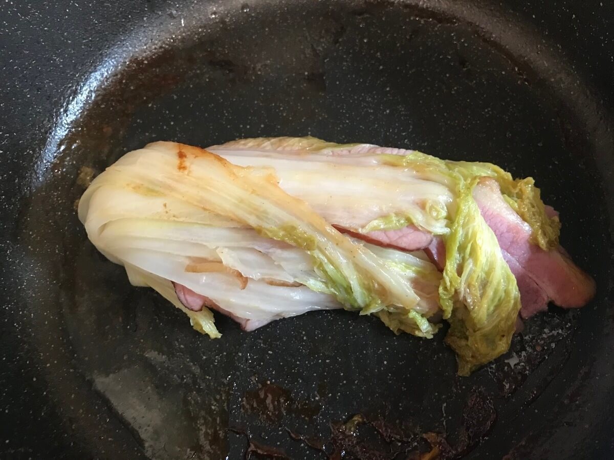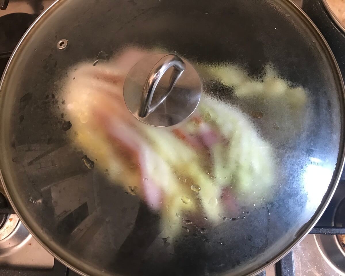 どんどん焼いていくほどに、白菜に含まれていた水分がでてきて、フライパンの中がグツグツと蒸し状態になっていきます。