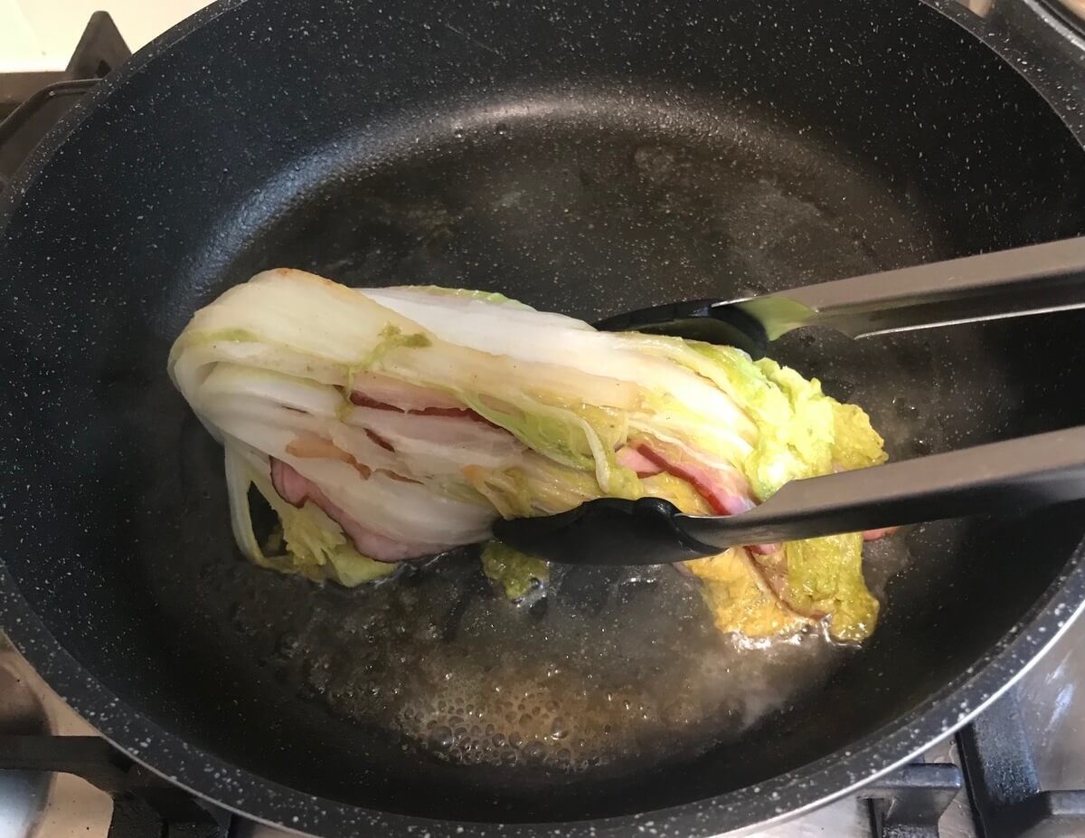 白菜の断面2面・外側の合計3面を「5分ずつ」焼いていきます。わたしは時短をはかって、焼き色をつけたあと蓋をして蒸し焼きにしました。