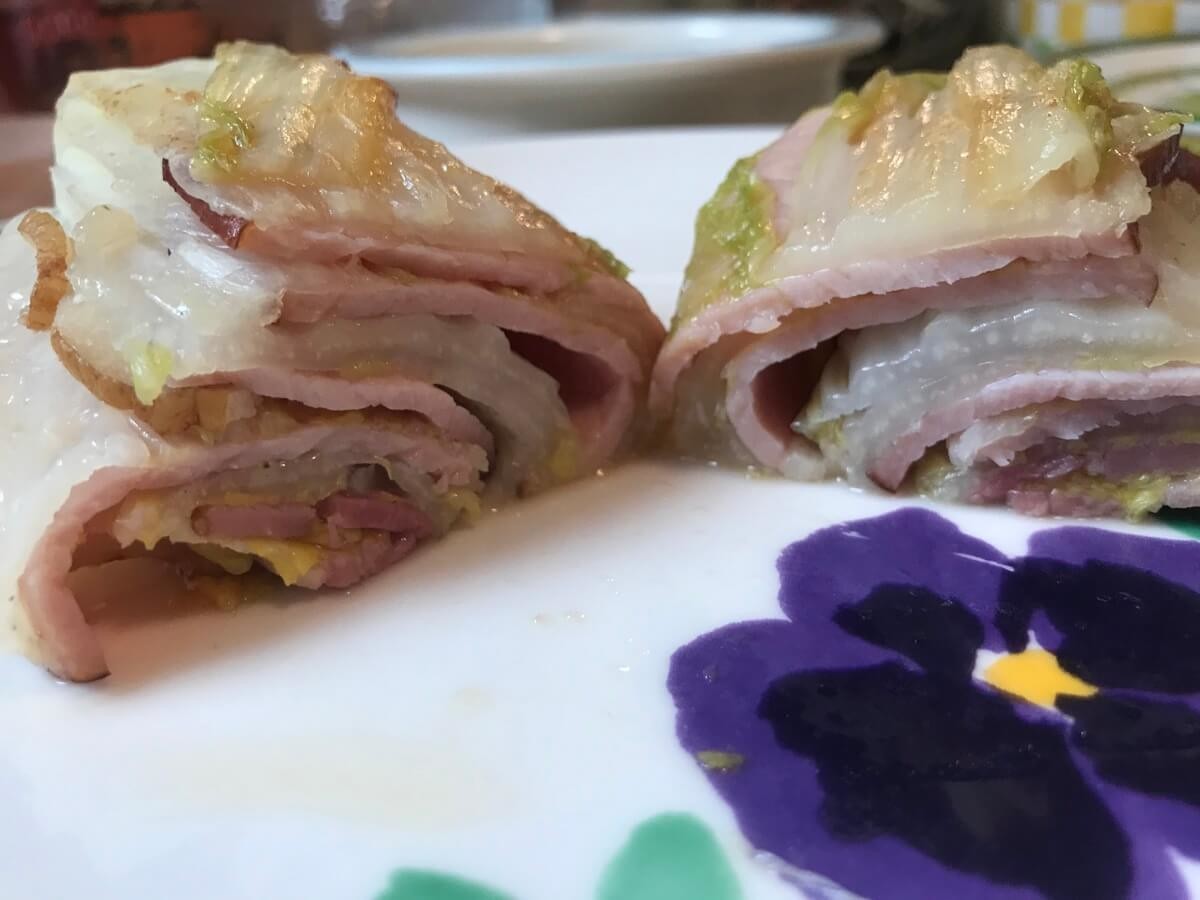 半分にカットした断面図は、白菜の白色とベーコンの赤色の色合いが綺麗で、見た目も映えています。まるでミルフィーユのようですね。