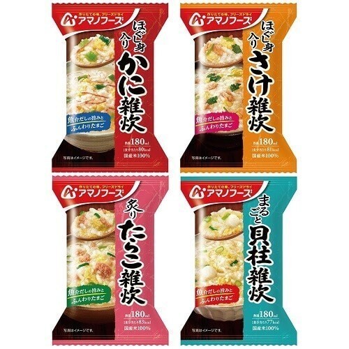 内容:ほぐし身入り かに雑炊/ほぐし身入り さけ雑炊/炙り たらこ雑炊/まるごと 貝柱雑炊<4種類×各1食>