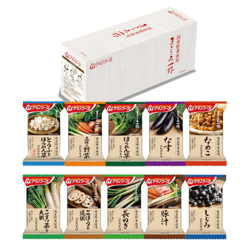 内容:【まごころ一杯 定番】とうふとほうれん草/五種の野菜/ほうれん草/なす/なめこ/こまつ菜と大根/ごぼうと蓮根/長ねぎ/豚汁/しじみ<10種類×各1食>