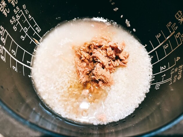作り方②炊飯器に米、【A】の調味料、ツナ缶を入れる