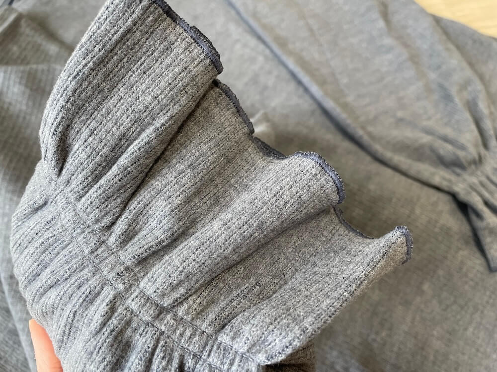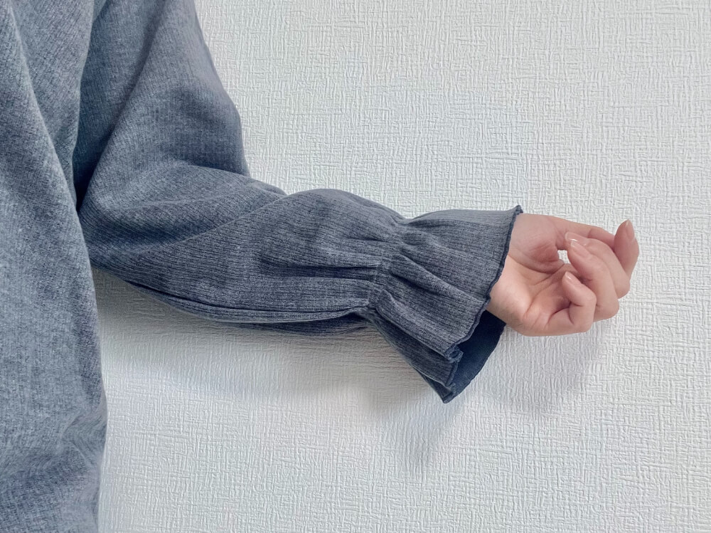 くすみカラーで袖口のフリルがアクセントの可愛いデザインと、うっすら起毛していて伸縮性がある素材は着心地も抜群です!
