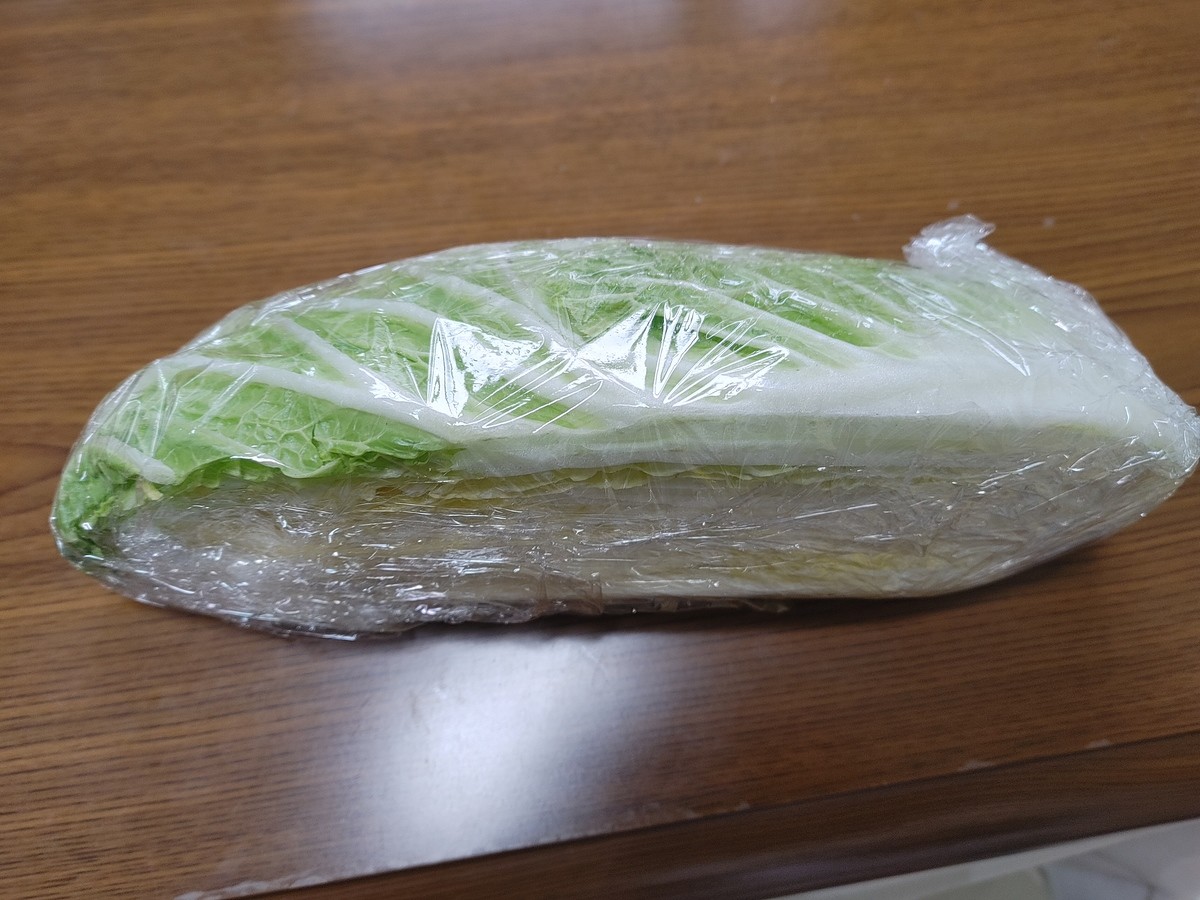 白菜の保存手順②ラップで包み「冷蔵室に立てる」
