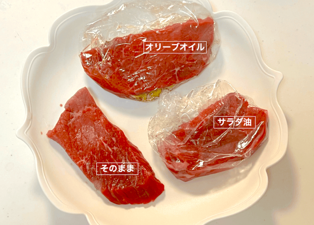 1番右が「オリーブオイル」、真ん中が「サラダ油」、左がそのままのお肉です。