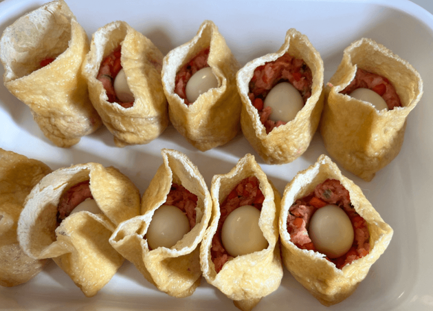 作り方③タネを10等分に分けたらうずらの卵とともに油揚げに詰め、爪楊枝で口を閉じる