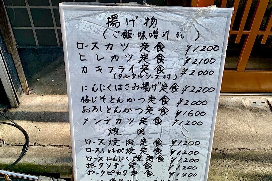 看板どおり、メニューは豚肉料理ひと筋といった感じで、カキフライだけが豚肉ではない、という内容です。嬉しいのは、庶民的なその値段です。ロースカツ定食が1,200円!