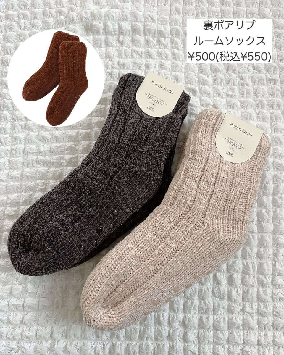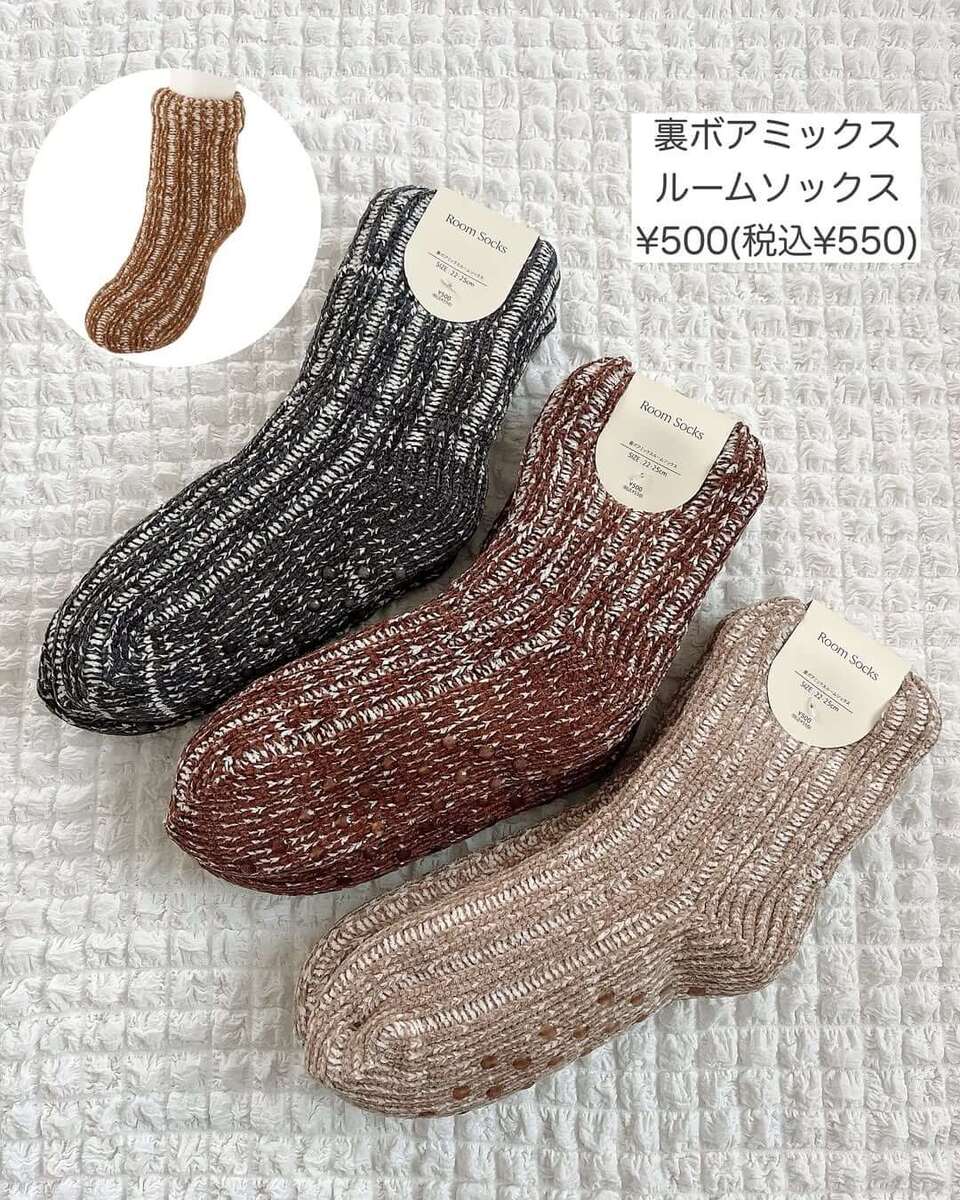 シンプルなデザインがお好みの方は、冬らしいおしゃれなリブデザインのルームソックスがおすすめ。ブラウン、チャコールグレー、ベージュの3色展開です。