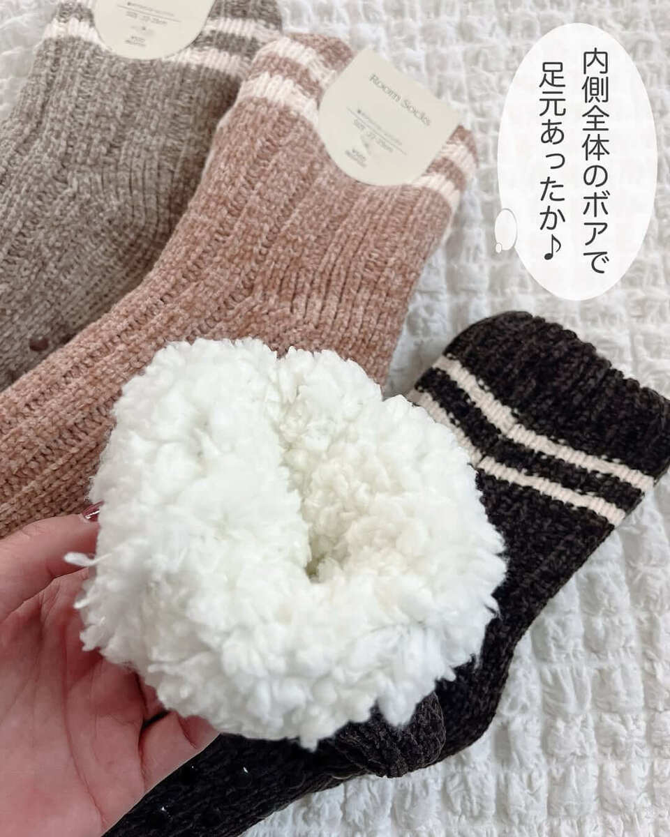 寒い冬の夜も3COINSのふわふわ素材ルームソックスや腹巻きがあれば、心地よい温かさと癒しの時間を楽しめるはず!