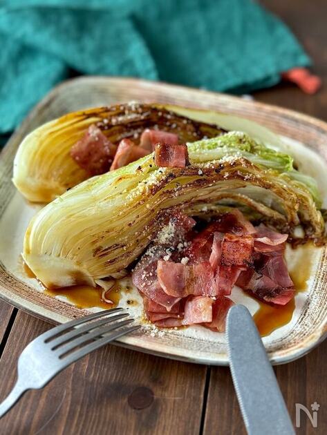 食材の旨味を楽しむシンプルな白菜おかず。フライパンで蒸し焼きにすることで、白菜の甘さを引き出します。カリカリベーコンと仕上げの醤油が蒸した白菜とよく合います。