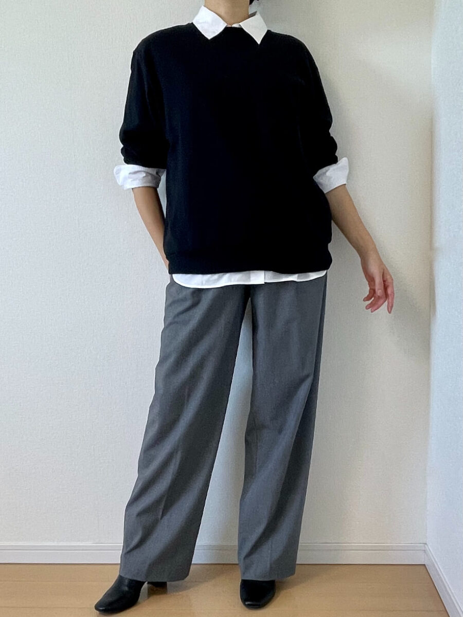 定番の白シャツをレイヤードして、ワイドパンツでメンズライクにまとめたかっちりコーデです!