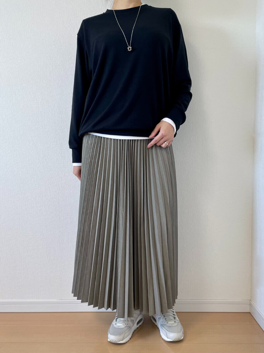 ボトムスもユニクロで「プリーツロングスカート」のグリーンを着用しています。