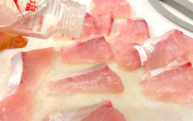 作り方①刺身を薄切りにして、塩とコショウをふる