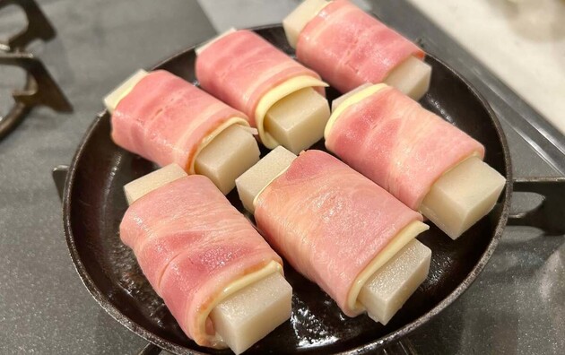 作り方②ベーコン、スライスチーズ切り餅の順にのせて巻く!