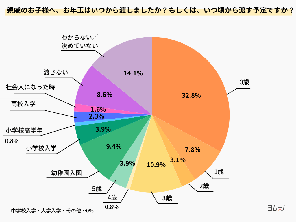 前問で自分の子どもに「0歳」から渡す方が11.7%しかいないのに対し、親戚の子どもには「0歳」から渡す方がおよそ3倍の32.8%。