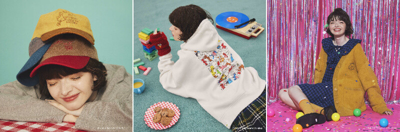 アパレルは、コミックアートをバックプリントしたフードパーカーや、実写フォトをデザインに施したロングTシャツ、人気キャラクターをジャカード織りで表現したニット、キャラクターの愛らしい表情を施した胸のワンポイント刺繍のスウェット、毛足が長いカラフルなカーディガンなどがラインアップ。ゆったりと身幅をもたせ、1サイズのみの展開のためユニセックスで着用できるアイテムです。