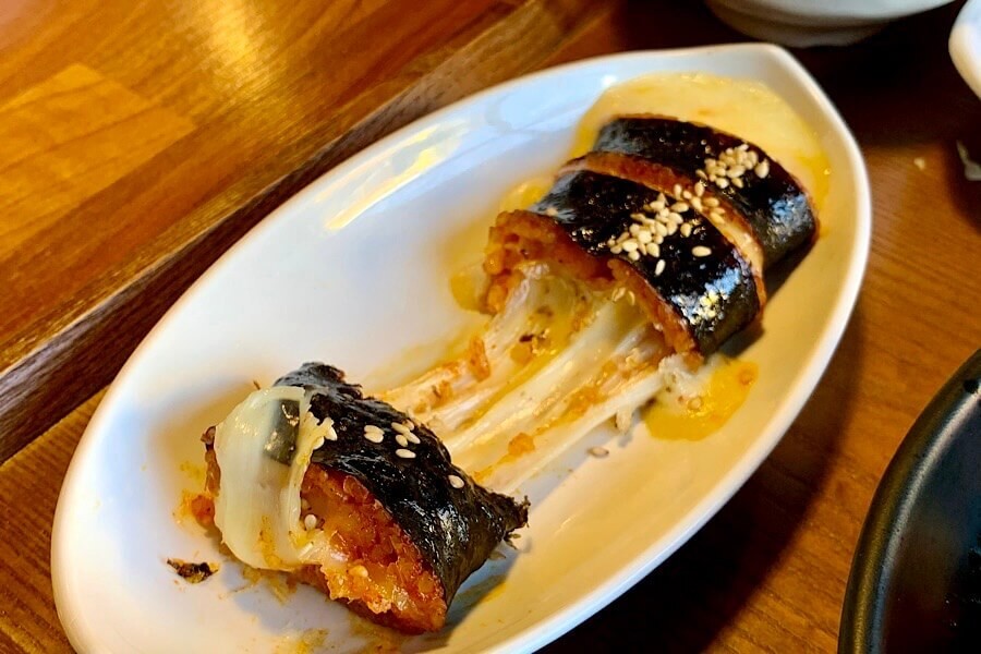 「レトロトンマッコル」では、漢江ラーメンの食べ放題に、サラダやキムチなど惣菜がいろいろついてきます。その中でも、漢江ラーメンと同じくらい面白かったのが、チーズキンパです。