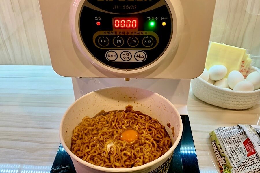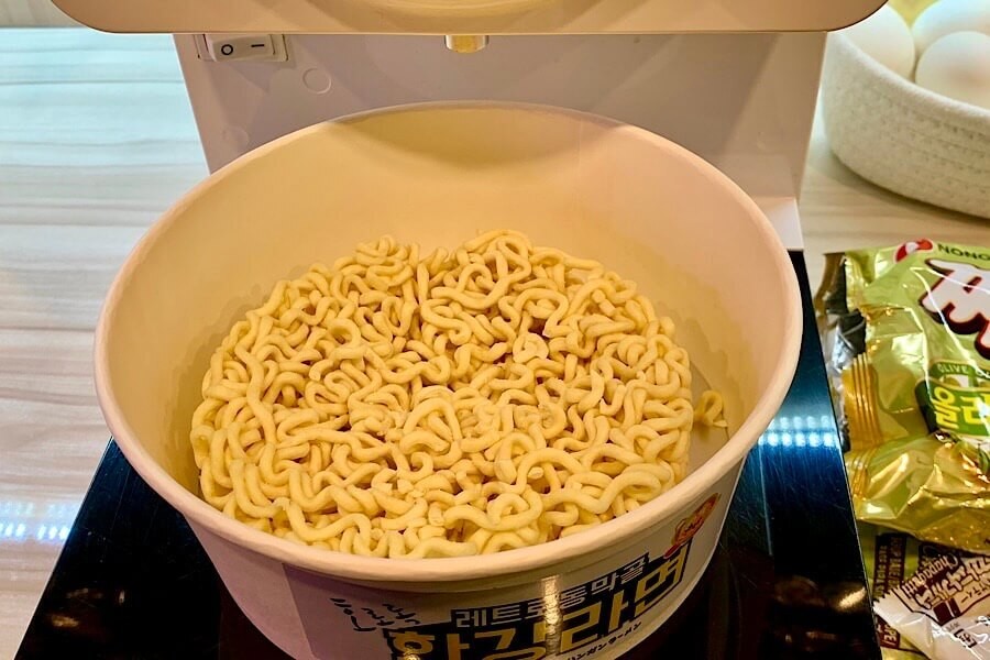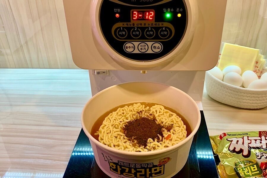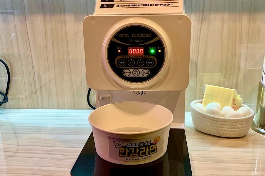 ちなみに、卵とチーズは好きなだけ入れていいそうです。これはお手軽!家でなくてもインスタント麺が作れる画期的な機械でした。