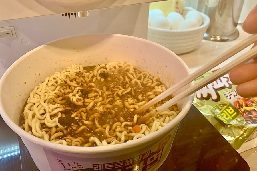 韓国のインスタント麺”チャパゲティ”の味はジャジャ麺みたいでしたが、味が薄くて微妙でした(笑)。