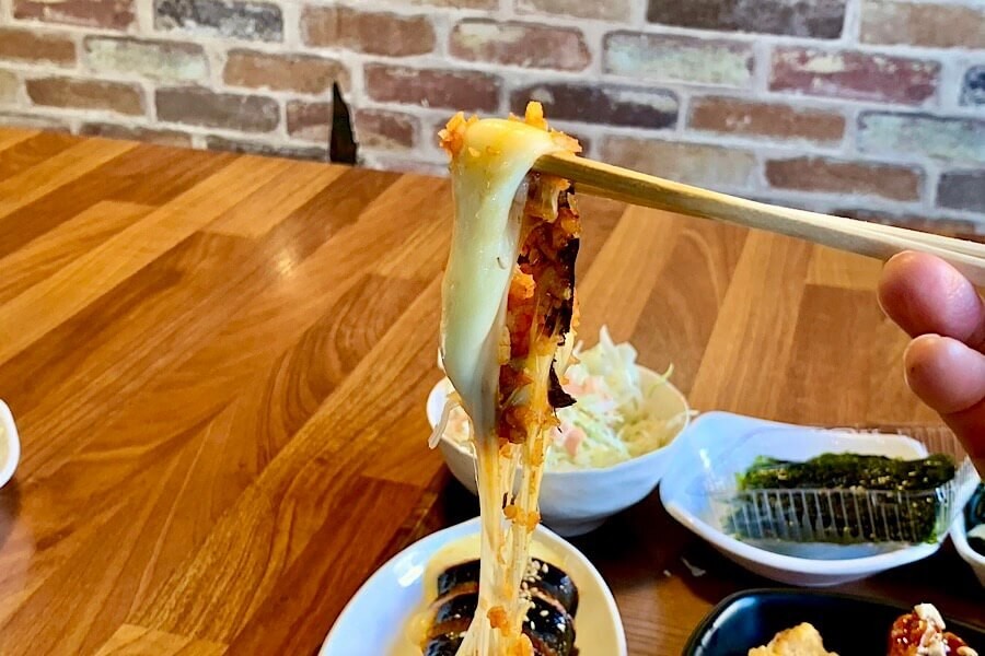 最初はキンパにチーズが挟んであるくらいだろうと思って普通に箸でひと切れつまむと、チーズが伸びる伸びる!
