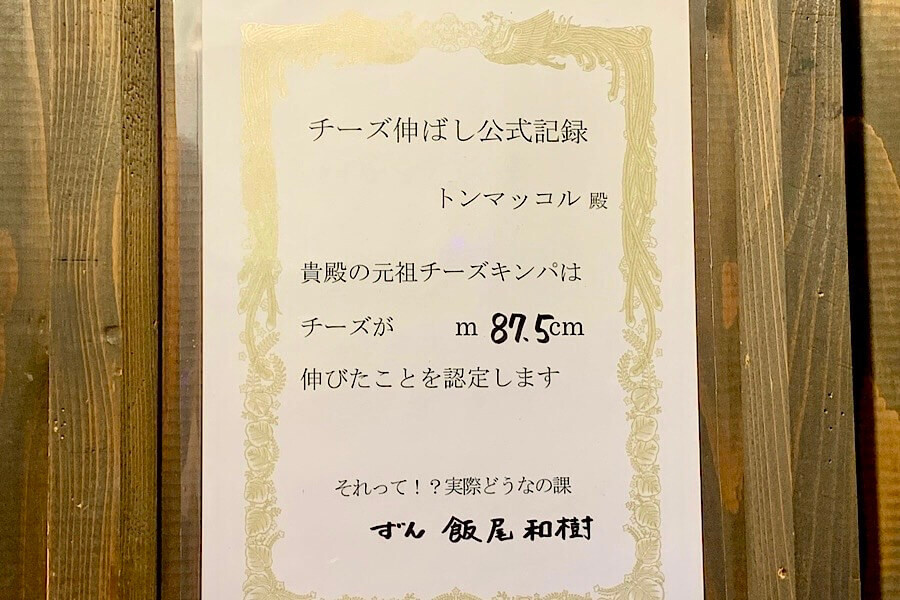 入店するときは気づかなかったのですが、入口のドア横にチーズが伸びることで表彰されている賞状がありました。TVのバラエティでチーズの長さを計ったようですね。