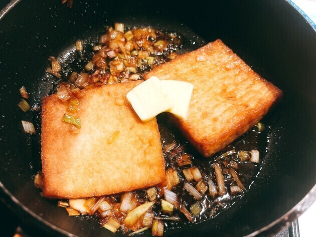 最初にねぎをじっくり炒めているので、旨味と甘味がものすごい。甘辛ダレにバターとねぎの旨味が合わさって、厚揚げがごちそうに変身しています。