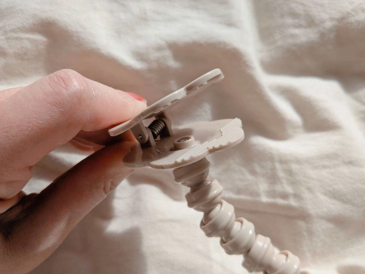 クリップにおやつを挟み、下部のホルダーをスマホに挟みましょう。