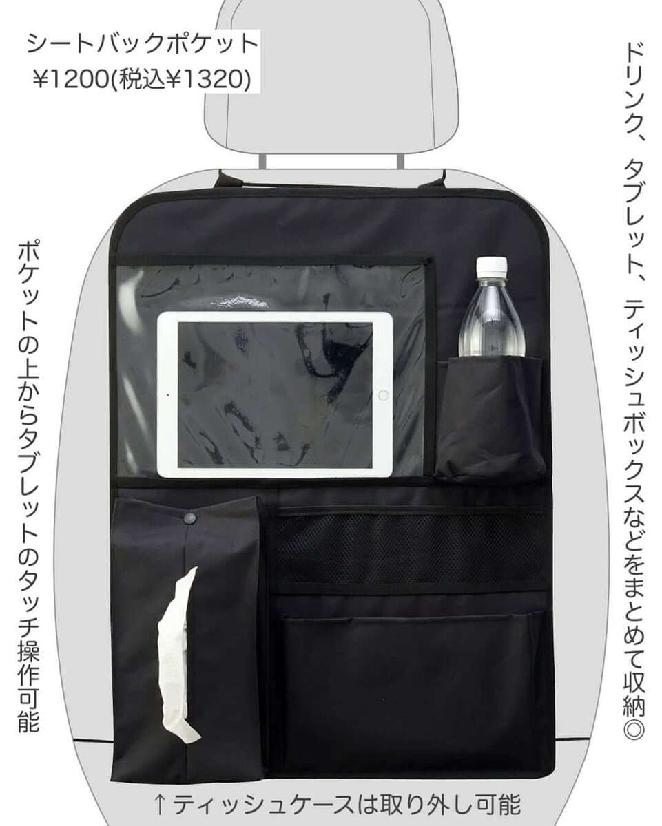 ティッシュケースは取り外し可能なので、後部座席はもちろん、前席でも使えます。ポケットの上からタブレットのタッチ操作もできる優秀アイテム!