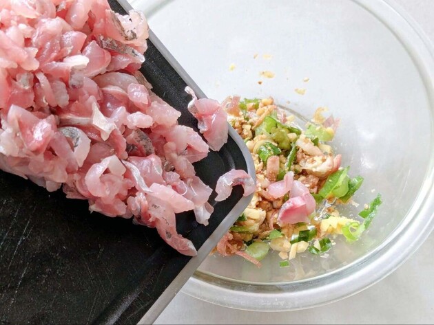 アジはさばいて、2cm幅に切りましょう。たたき用を使ったため、少しカットし大きさを揃えました。
