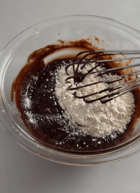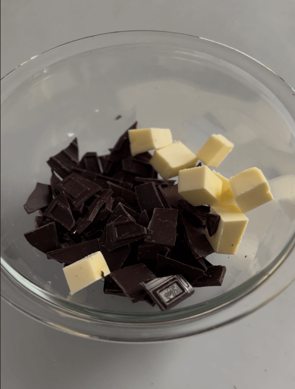 ①耐熱ボウルに割ったチョコとバターを入れる。電子レンジで2分加熱して溶かし、泡立て器で混ぜる。