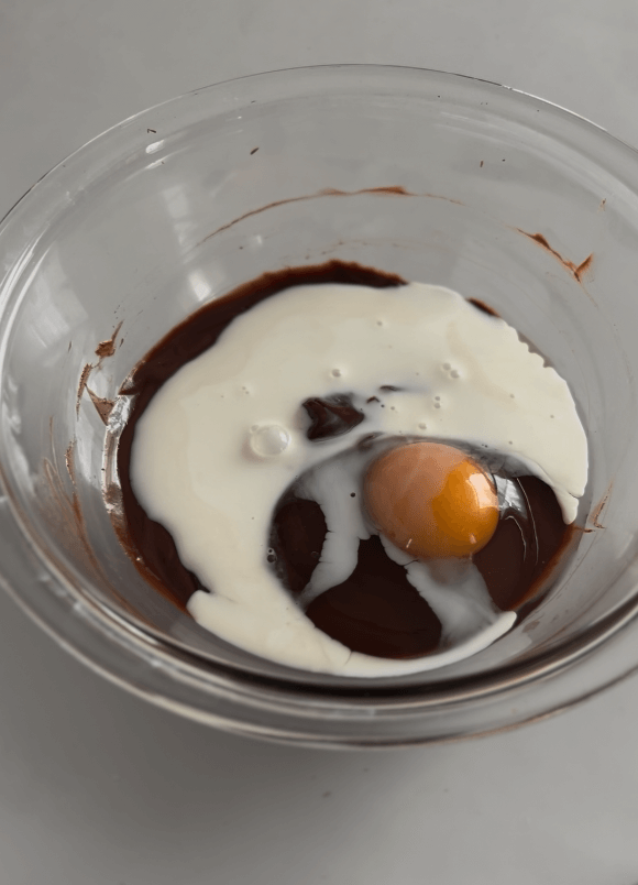 ②卵を割り入れて牛乳を加え、よく混ぜ合わせる。