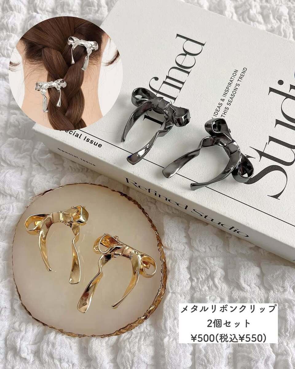 メタル感がおしゃれ!小ぶりのリボンを散らせばトレンド感あふれるヘアスタイルに変身。