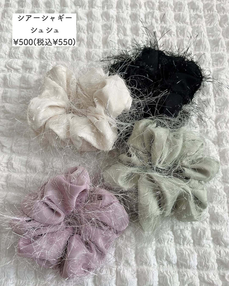 シャギーが目を惹く、凝ったデザインのシュシュ。結ぶだけでおしゃれ感UPします!