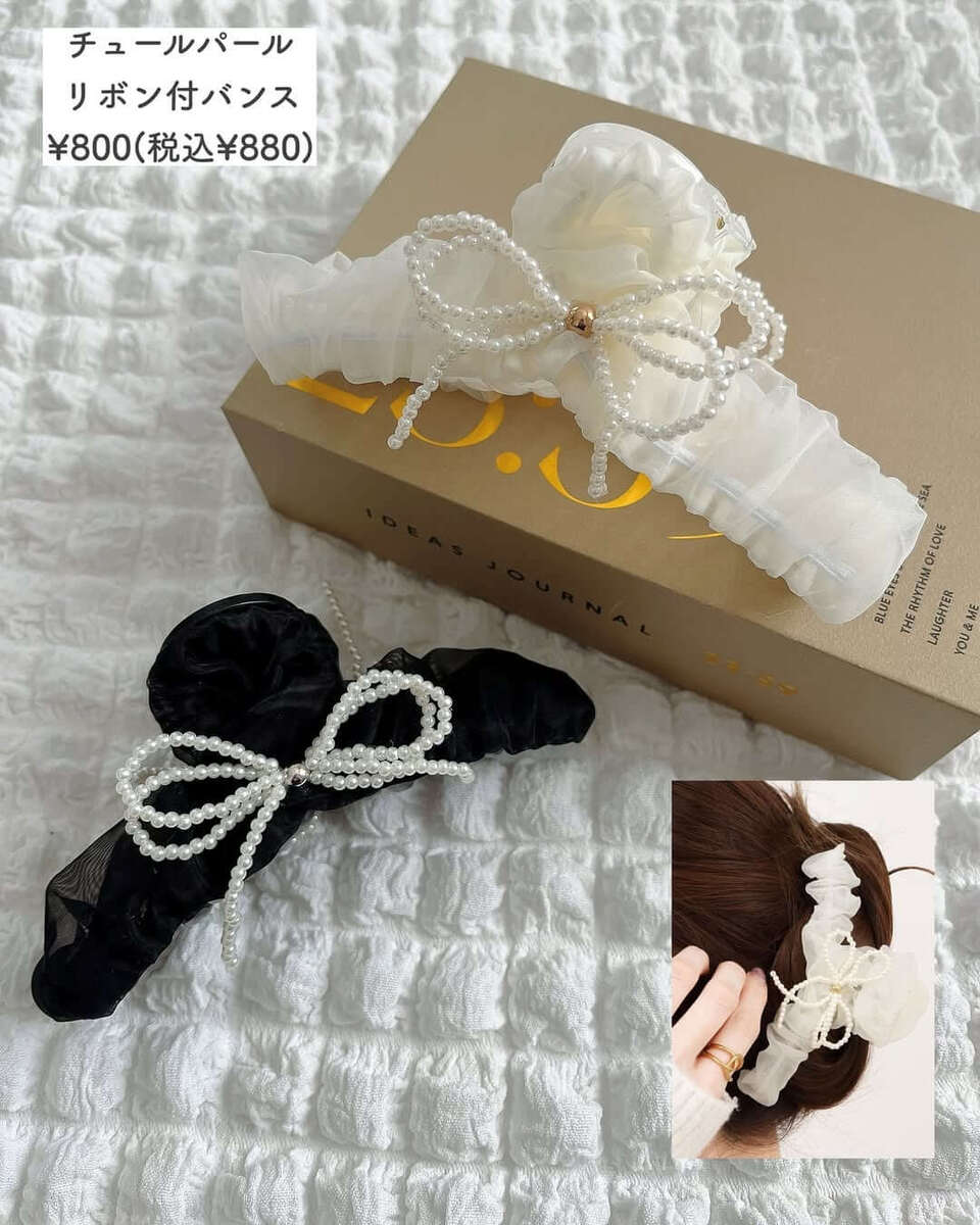 ふわふわのチュールでフェミニンなスタイルに合わせたいアイテム。食事会やデートなど、あらゆるシーンで活躍しそうなバンスは一つ持っておくといざというときに便利ですね。