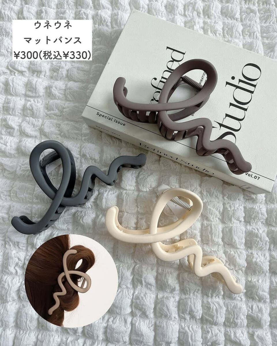 ウネウネのデザインとマットな質感が特徴。さっと髪に留めるだけで簡単に「おしゃれ上級者感」を出せるアイテムです!