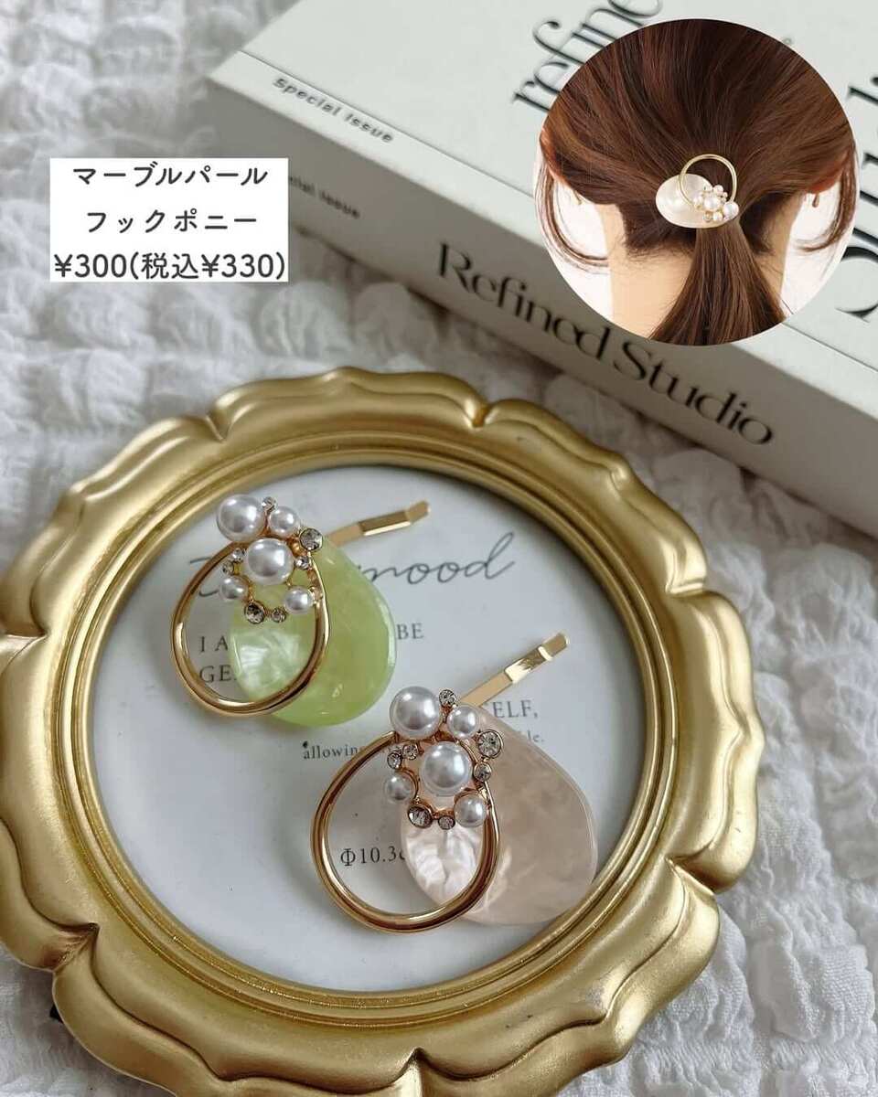 写真上:パールリボン付マーブルバンス ¥330(税込)