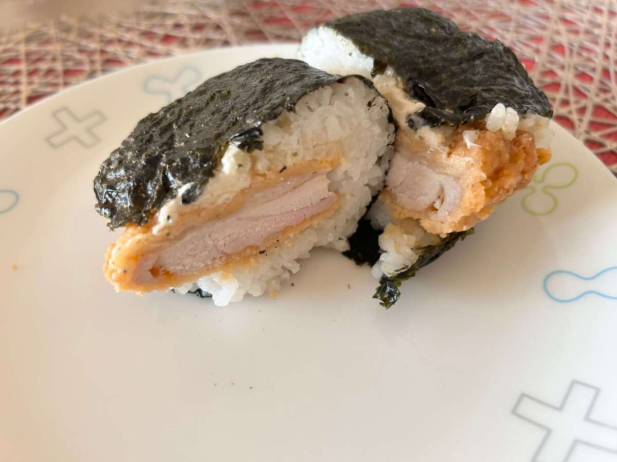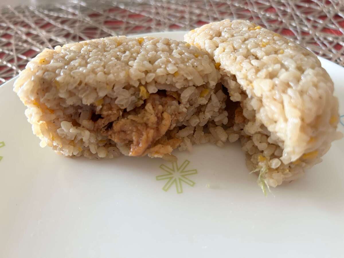 米、チキン、マヨネーズととにかく盛りだくさんな一品。筆者は一個でかなりお腹いっぱいになった、ボリューム満点のおにぎりです!